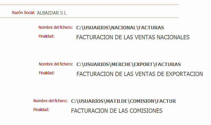 - Nombre del fichero: C:UsuarioMercheExportFacturas o C:UsuarioMatildeExportFacturas
