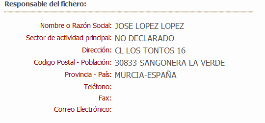 Dirección del responsable. Es obligatorio indicar la dirección del responsable, sin embargo algunos ficheros tienen una dirección inexistente, o al menos a mí me ha sido imposible ubicarla: